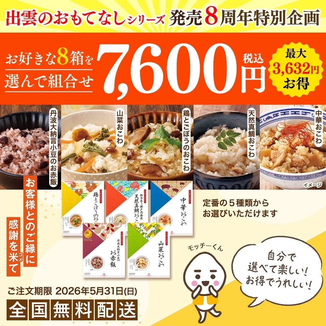 他の画像を見る 出雲のおもてなし 柚子香る瀬戸内海産天然真鯛おこわ えらべる企画対象(おこわ) 通常価格 ¥ 1,404 税込 販売期間 〜 2026/05/31 23:59 詳細を見る お気に入りに登録する
