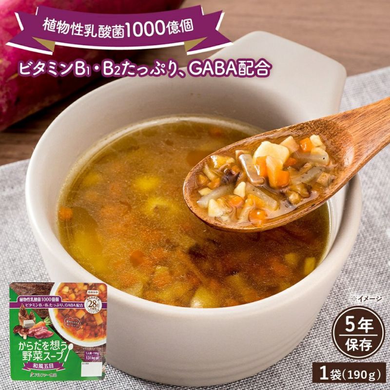 いつでもおいしい、からだにうれしい、野菜たっぷりのスープです。 さつまいも・にんじん・こんにゃく・たけのこ・しいたけを使い、かつお風味の旨みが効いた、やさしい味わいの和風五目スープです。