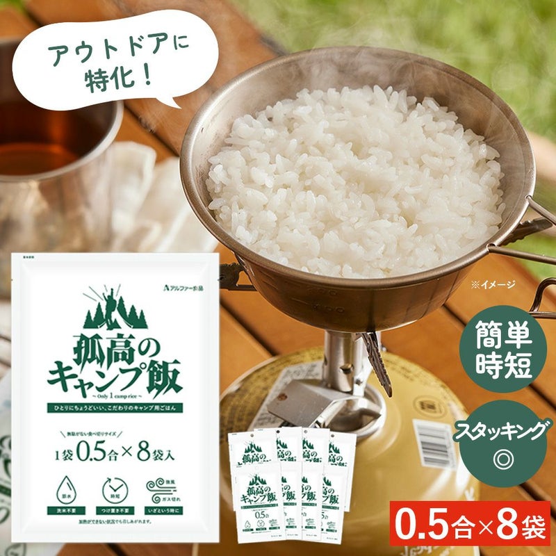 「孤高のキャンプ飯」は100%国産米を持ち運びしやすく食べきりサイズの0.5合分に仕上げています。 洗米・つけ置きも不要のため時短調理も可能!