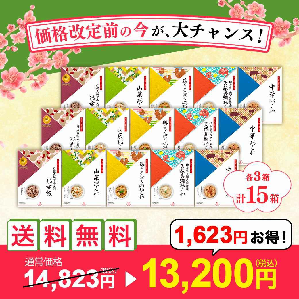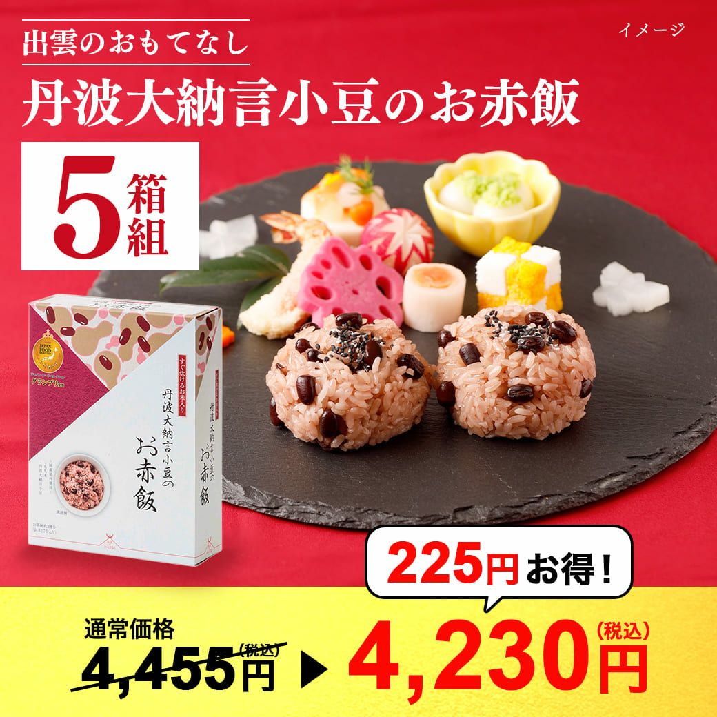 他の画像を見る 出雲のおもてなし丹波大納言小豆のお赤飯 5箱組 通常価格 ¥ 4,455 のところ 期間限定・特別価格 ¥ 4,230 税込 販売期間 2026/02/02 10:00 〜 2026/02/27 23:59 カートに入れる お気に入りに登録する