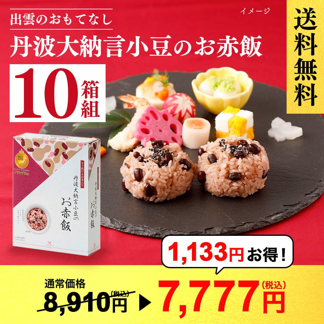他の画像を見る 出雲のおもてなし丹波大納言小豆のお赤飯 10箱組 通常価格 ¥ 8,910 のところ 期間限定・特別価格 ¥ 7,777 税込 販売期間 2026/02/02 10:00 〜 2026/02/27 23:59 カートに入れる お気に入りに登録する