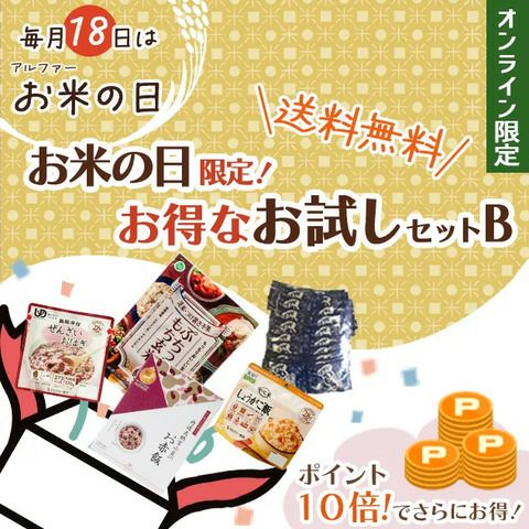 丹波大納言小豆のお赤飯×1箱、ぷちっともち玄米 900g×1袋、ソフトひじきふりかけ(2.8g×40袋)×1袋、ぜんざいおはぎ(レトルト)×1袋、安心米しょうがご飯(玄米入り)×1袋