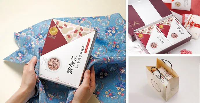 ひょうたん柄は、家運興隆・子孫繁栄・商売繁盛などを表わします。「幸せを願う」そんな想いを赤飯にもパッケージにも込めています。