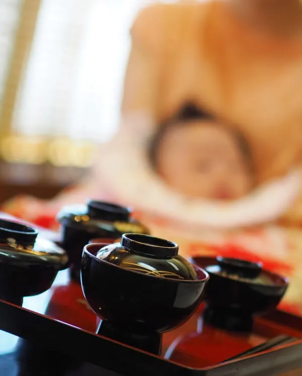 男の子は朱色の漆器、女の子は外側が黒色、内側が朱色の漆器を使います。