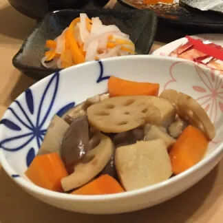 かぼちゃ、レンコン、たけのこ、里芋などの食材を使用した煮物。筑前煮を作る家庭が多いようです。