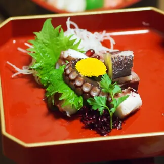 季節の野菜を漬けた物、紅白なます、タコの酢の物、梅干し、など。